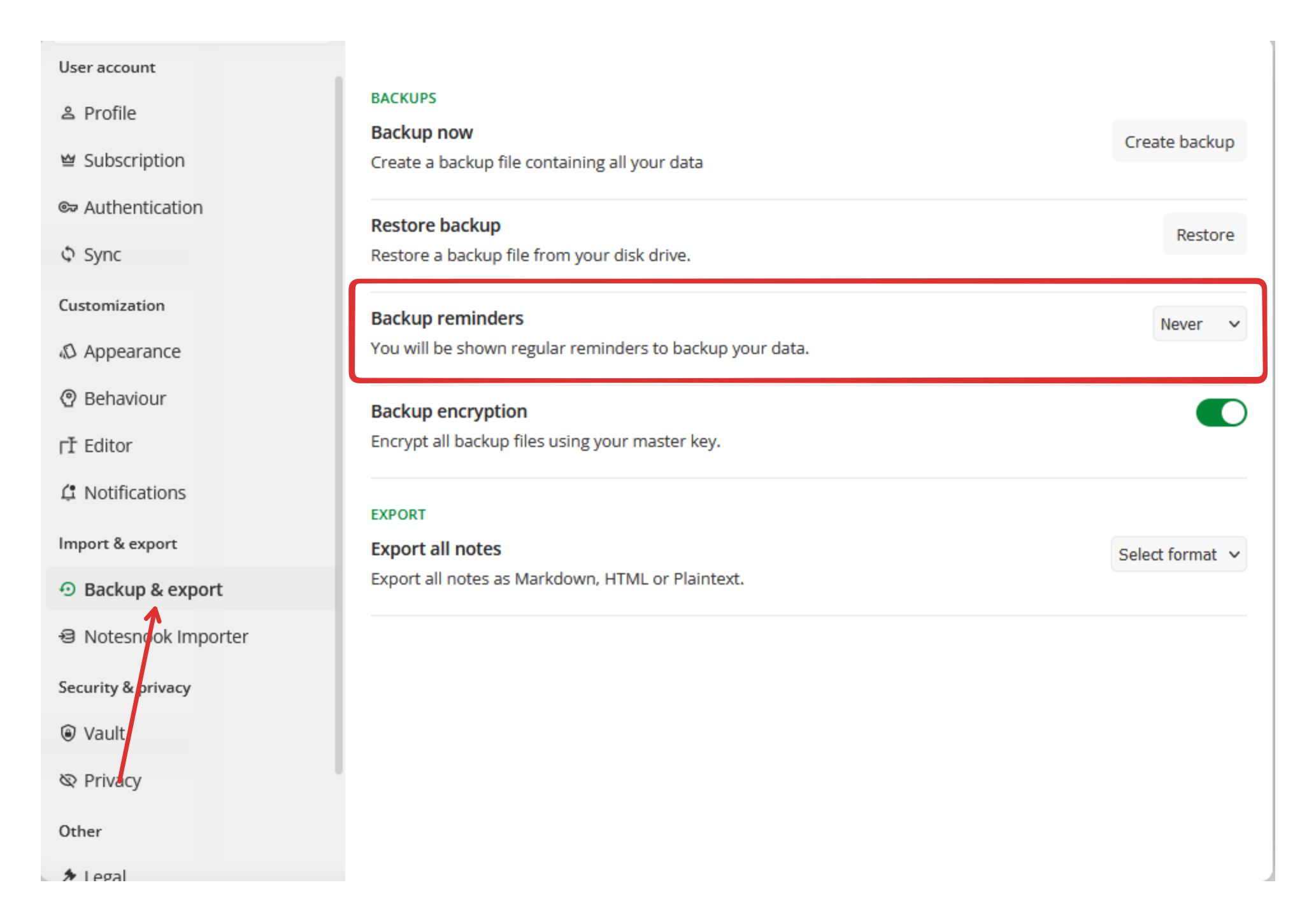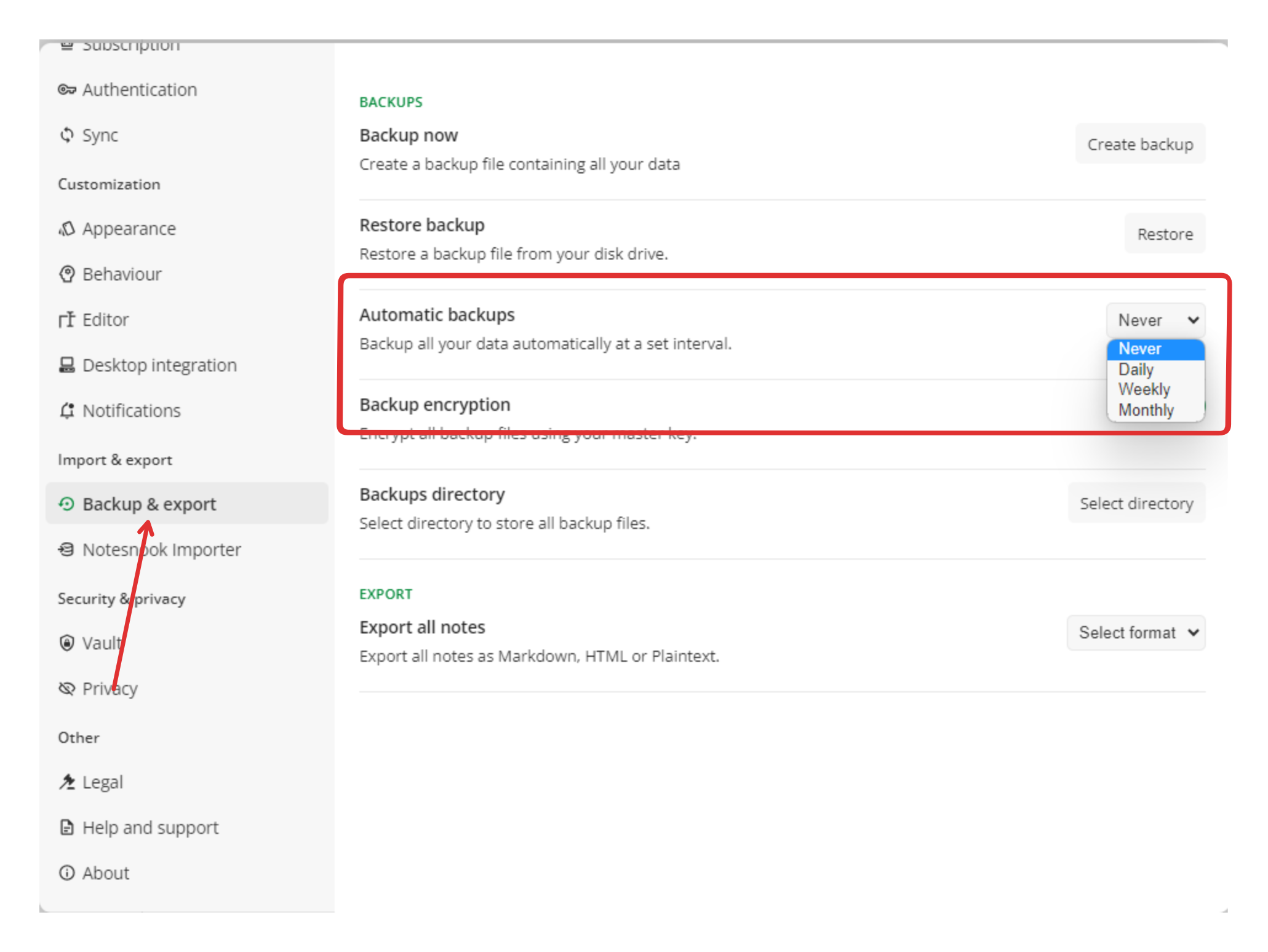 For maximum safety against potential data loss, you can enable daily, weekly or monthly backups of your notes. Enabling automatic backups will ensure that all your data is safely backed up locally after a regular interval.