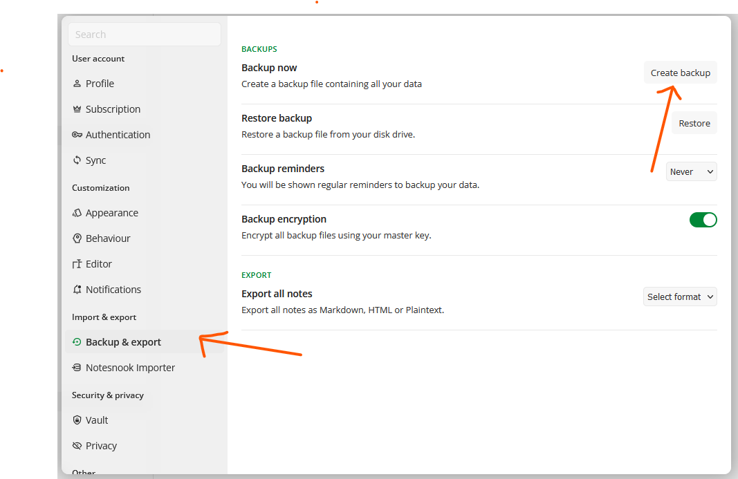 Backup & export sectionCreate backup under Backup now heading to create a new .nnbackupz file