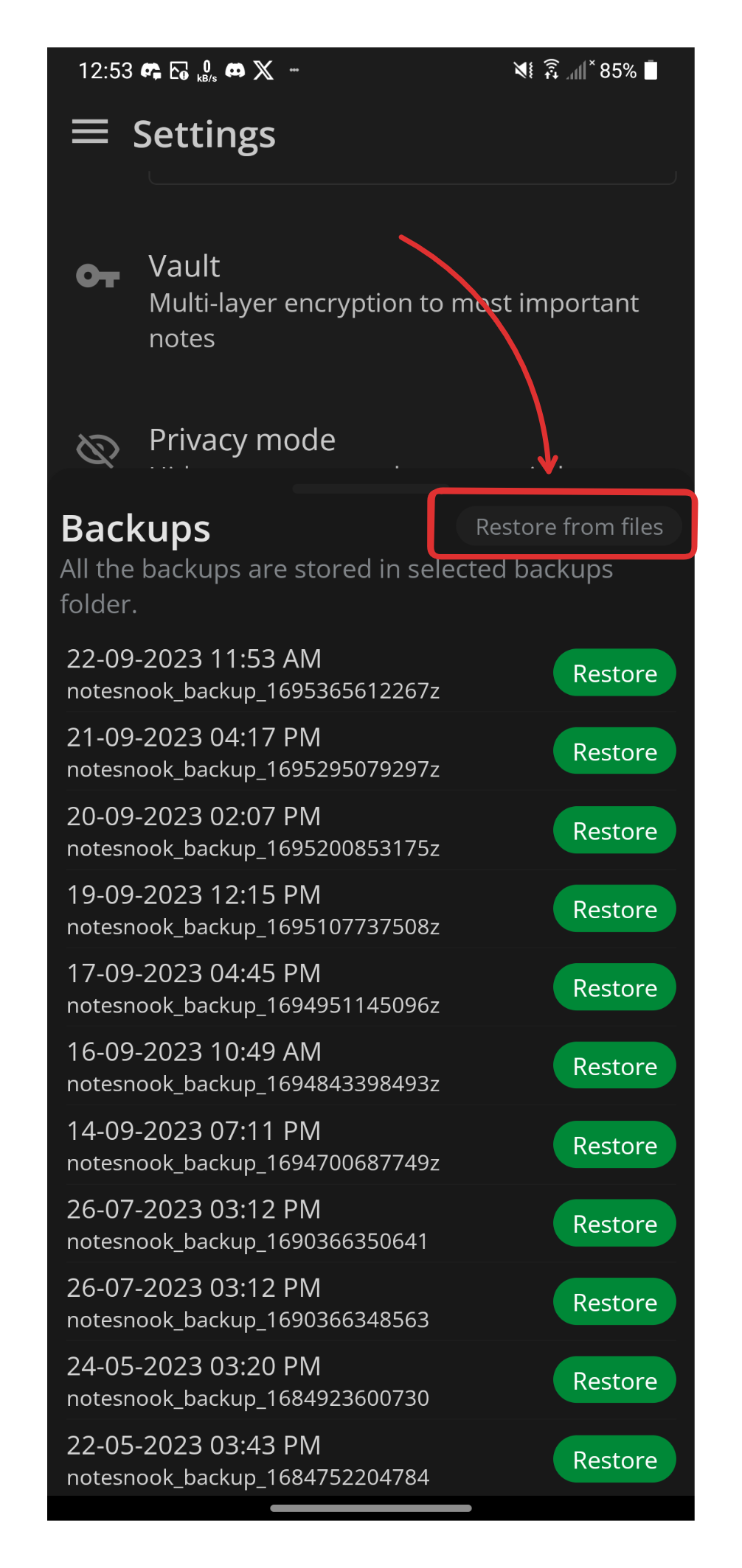 Backup & export sectionRestore button next to Restore backup heading.nnbackupz or .nnbackup file from your PC that you want to restore.Backup & Restore sectionRestore backupRestore backup sheet, select the backup you want to restore. If your backup file is located in some other location, click on Restore from files on top right corner of the sheet then select the backup file.