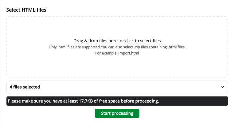 - Drop your .html files, or click anywhere inside the box to browse and select your .html files. You can also provide a .zip file containing all your .html files. Then click “Start processing”.