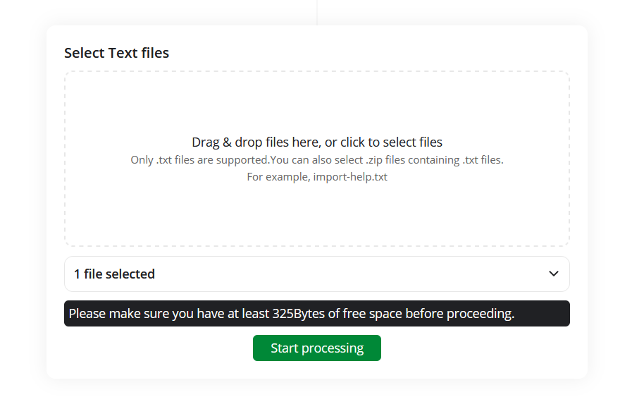 - Drop your .txt files, or click anywhere inside the box to browse and select your .txt files. You can also provide a .zip file containing all your .txt files. Then click “Start processing”.